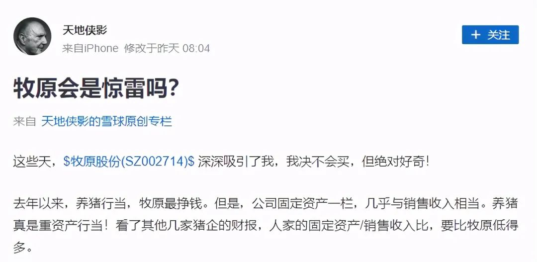 雪球是較為知名的投資者交流社區(qū)。在發(fā)布于雪球的《牧原會(huì)是驚雷嗎?》一文中,“天地俠影”指出,牧原股份的固定資產(chǎn)和幾乎與銷售收入相當(dāng),而其他幾家豬企要低很多。他認(rèn)為:“去年以來,牧原養(yǎng)豬未必掙到真金白銀,但是蓋豬圈的人,肯定把錢掙飽了”。