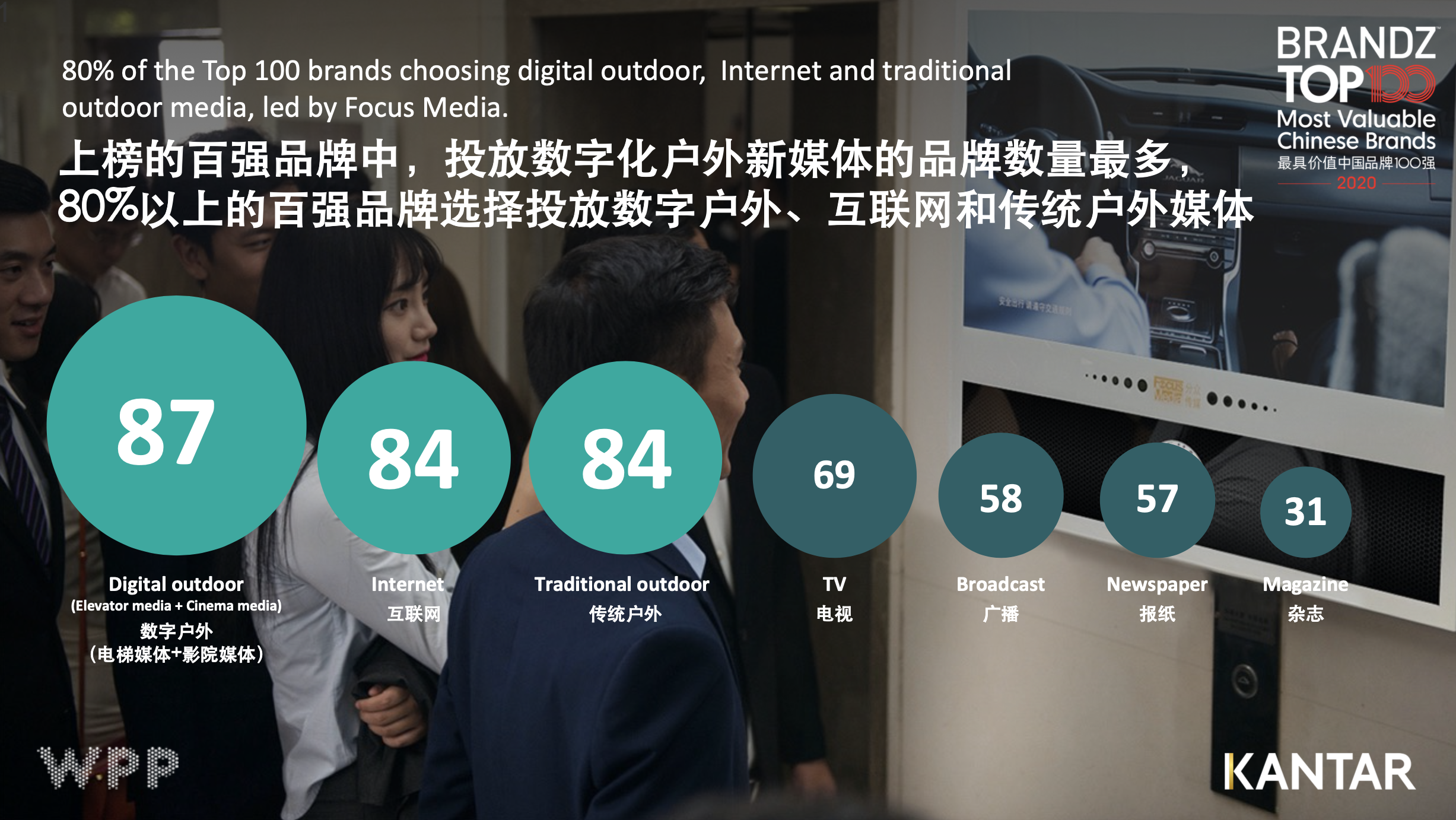 分眾長(zhǎng)期穩(wěn)固的受眾注意力價(jià)值與品牌引爆能力正獲得更廣泛客戶的青睞。在WPP與凱度共同發(fā)布的2020年“BrandZ™最具價(jià)值中國(guó)品牌100強(qiáng)”榜單中,投放分眾為代表的數(shù)字化戶外新媒體的品牌數(shù)量占87%。