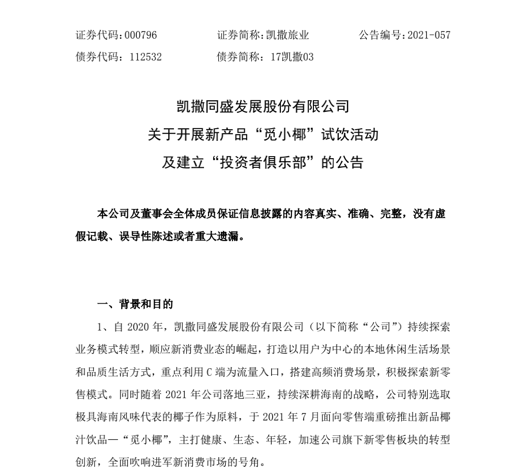 公告稱,為讓投資者更好地了解公司首款面向零售端的椰汁飲品“覓小椰”,凱撒旅業(yè)通過“凱撒旅業(yè)投資者俱樂部”,向全體股東開展“覓小椰”試飲活動,并征集產(chǎn)品試用后的意見或建議。截至2021年8月4日(公司2021年第一次臨時股東大會股權(quán)登記日)下午收市在中國證券登記結(jié)算有限責(zé)任公司深圳分公司登記在冊的持有公司股份的股東,只需關(guān)注鐺鐺社交APP上的“凱撒旅業(yè)投資者俱樂部”公眾圈,就可申領(lǐng)公司免費贈送的覓小椰一箱(規(guī)格245ml*8盒)。