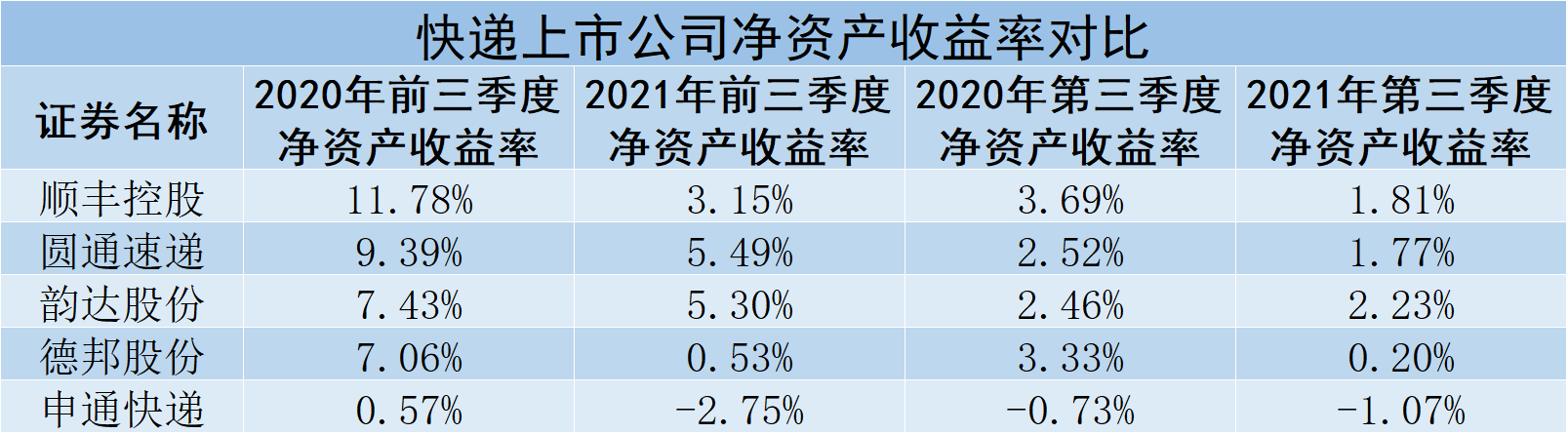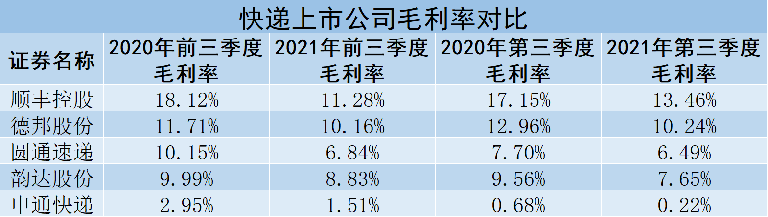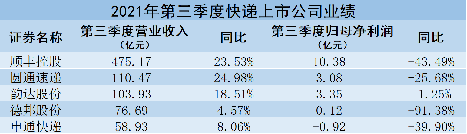 從2021年第三季度快遞上市公司業(yè)績來看,5家公司第三季度依舊延續(xù)增收不增利的態(tài)勢(shì)。5家公司第三季度實(shí)現(xiàn)營業(yè)收入平均增長15.93%;剔除第三季度歸母凈利潤虧損的申通快遞,其余4家公司歸母凈利潤同比平均下降40.45%。