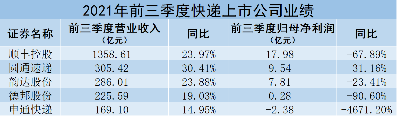 從2021年前三季度快遞上市公司業(yè)績來看,5家公司前三季度營業(yè)收入均實(shí)現(xiàn)不同程度增長,平均增幅為22.45%。然而在實(shí)現(xiàn)歸母凈利潤方面,5家公司都呈現(xiàn)不同程度的下滑;剔除前三季度歸母凈利潤虧損的申通快遞,其余4家公司歸母凈利潤同比平均下降53.26%。