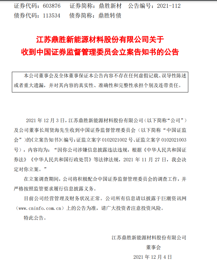 12月3日晚間,鼎勝新材發(fā)布公告稱,公司及董事長(zhǎng)周賢海收到中國(guó)證監(jiān)會(huì)的《立案告知書》,因涉嫌信息披露違法違規(guī),11月27日,中國(guó)證監(jiān)會(huì)決定立案。“在立案調(diào)查期間,公司將積極配合中國(guó)證券監(jiān)督管理委員會(huì)的調(diào)查工作,并嚴(yán)格按照監(jiān)管要求履行信息披露義務(wù)。目前公司經(jīng)營(yíng)管理及財(cái)務(wù)狀況正常。”鼎勝新材在公告里表示。