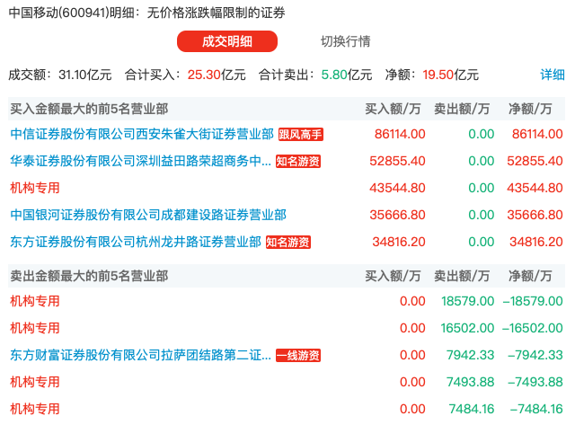 同時,同花順顯示,今日中國移動A股也登上龍虎榜,凈買入額為19.5億元,買入前五名包括多家知名券商營業(yè)部。
