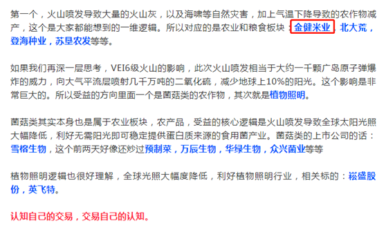在這一舉動的背后,還有游資精心布局,一部分A股標的物被整理出來,貼上“火山利好”概念,概念炒作、操縱股價、高位派發(fā)的“擊鼓傳花”游戲已是蓄勢待發(fā)。主業(yè)是糧油深加工的金健米業(yè)也被自媒體標上“火山利好”概念。