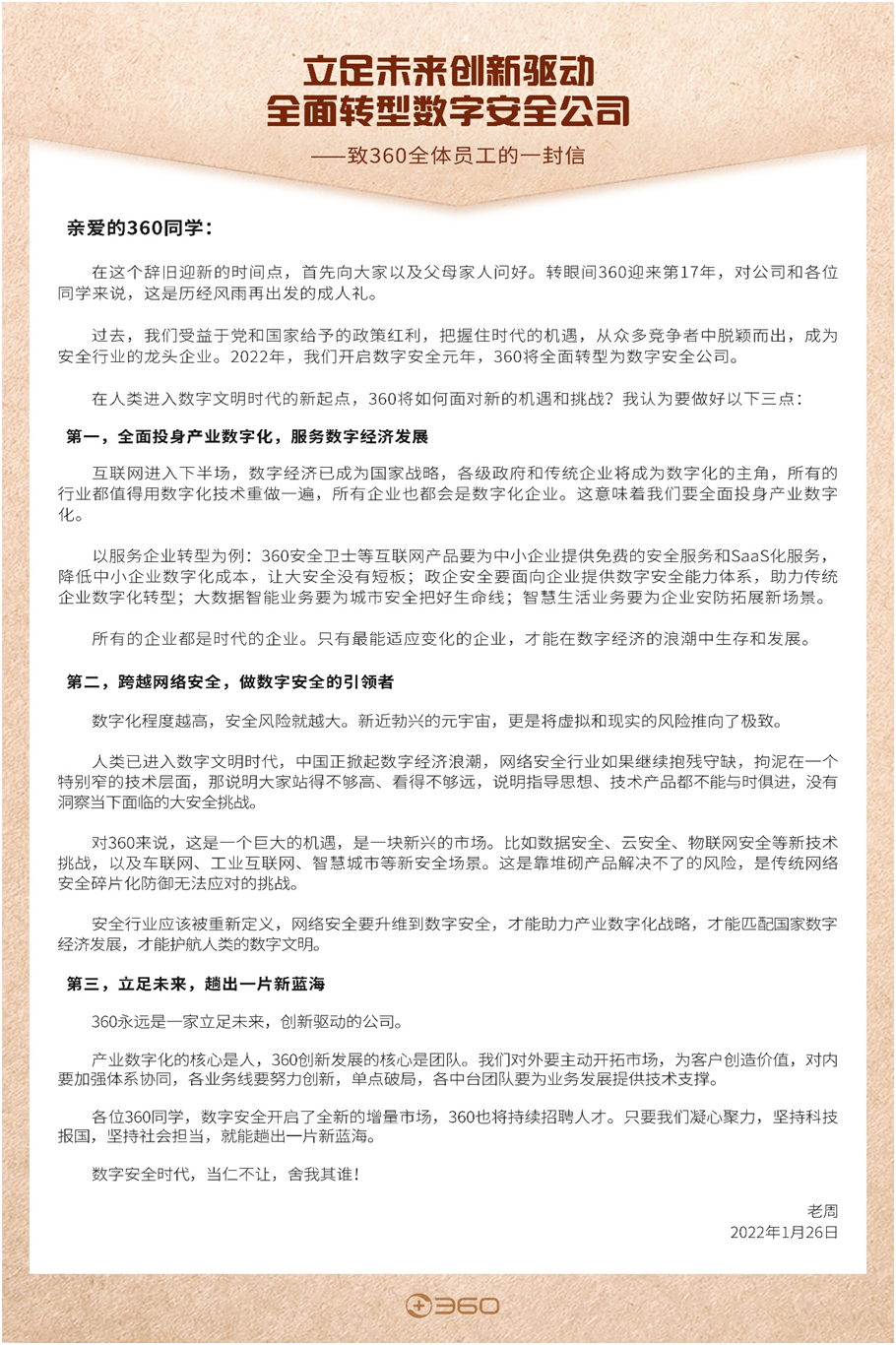 1月26日,360集團(tuán)創(chuàng)始人周鴻祎發(fā)出內(nèi)部全員信,宣布360全面轉(zhuǎn)型數(shù)字安全公司。2022年數(shù)字安全元年到來,同時(shí)開啟了全新增量市場(chǎng),周鴻祎稱360將持續(xù)招聘人才。