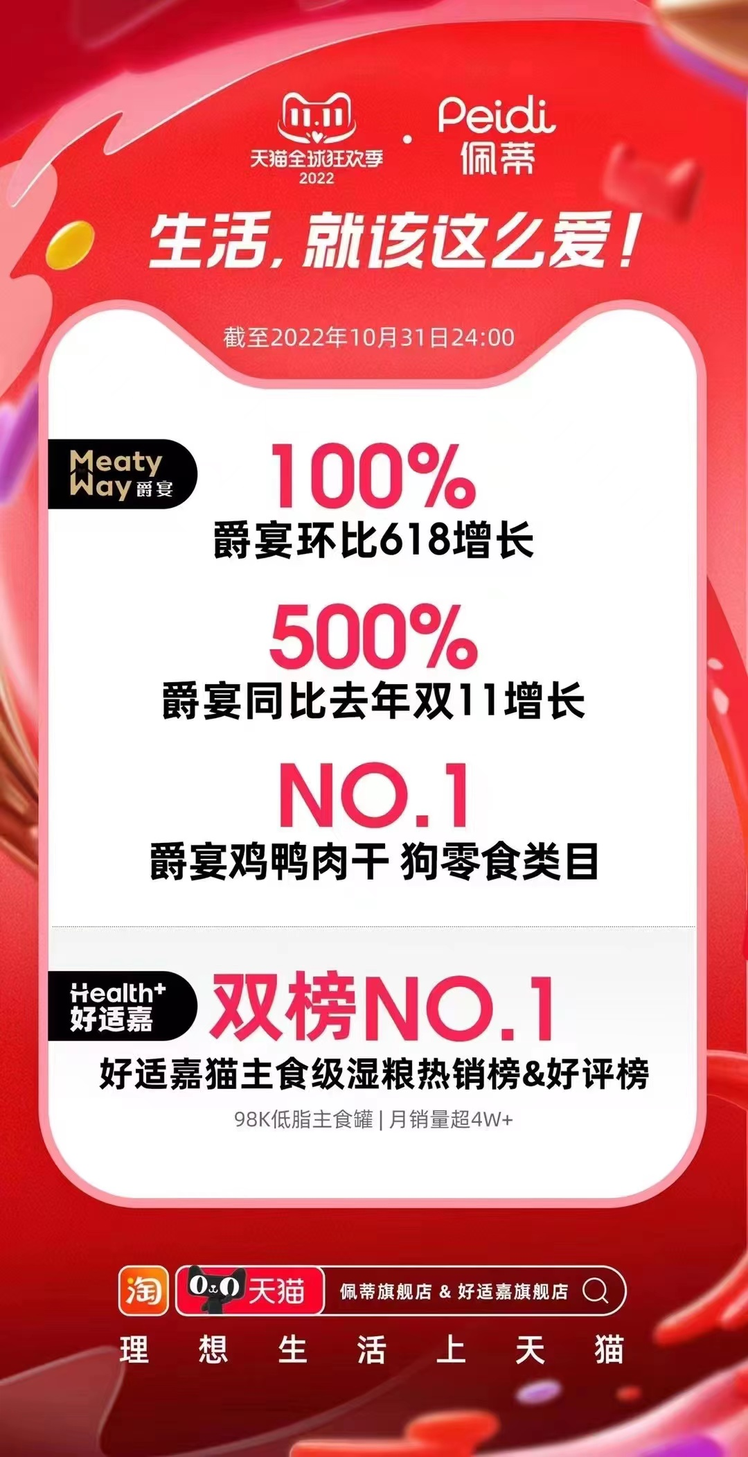 在“年度狗類爆款大獎”榜單中,佩蒂出品的爵宴鴨胸肉干榜上有名。截至10月31日,在今年的“雙11”活動中,爵宴鴨胸肉干成績斐然,已摘得天貓狗零食類目NO.1。爵宴品牌整體環(huán)比618增長100%,同比去年“雙11”增長500%。