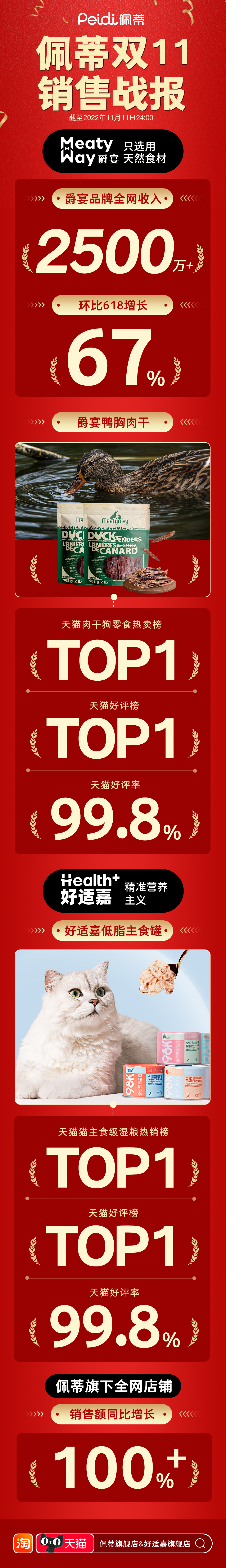 “雙11”期間,佩蒂股份旗下全網(wǎng)店鋪銷售額同比增長超100%。狗類產(chǎn)品中,爵宴鴨肉干登上了天貓肉干狗零食熱賣榜TOP1、天貓好評榜TOP1,好評率達99.8%;貓類產(chǎn)品好適嘉低脂主食罐表現(xiàn)同樣亮眼,登上了天貓貓主食級濕糧熱銷榜TOP1、天貓好評榜TOP1,好評率同樣高達99.8%,以實力贏得了寵物主的關(guān)注。