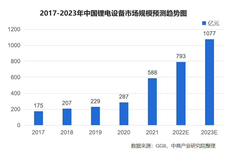 近年,全球動力電池需求量大幅增加,未來幾年動力電池仍將持續(xù)緊缺,電池產(chǎn)能擴產(chǎn)將持續(xù)拉動鋰電池裝備行業(yè)。據(jù)GGII預(yù)計,2025年全球動力電池出貨量將達(dá)到1550GWh,2030年有望達(dá)到3000GWh。而2021年中國鋰電設(shè)備市場規(guī)模為588億元,2017年至2021年市場規(guī)模年均復(fù)合增長率為27.4%,預(yù)計2023年中國鋰電設(shè)備市場規(guī)模將達(dá)1077億元。