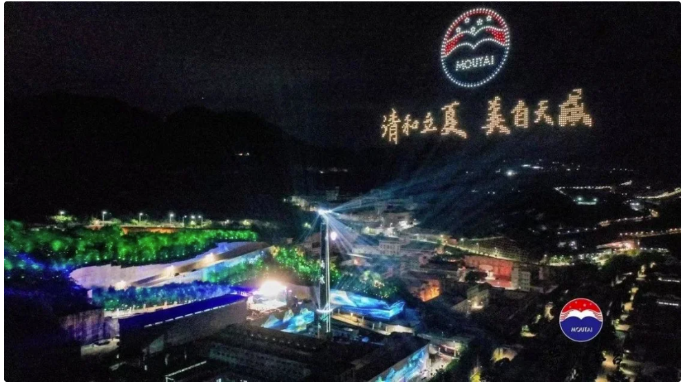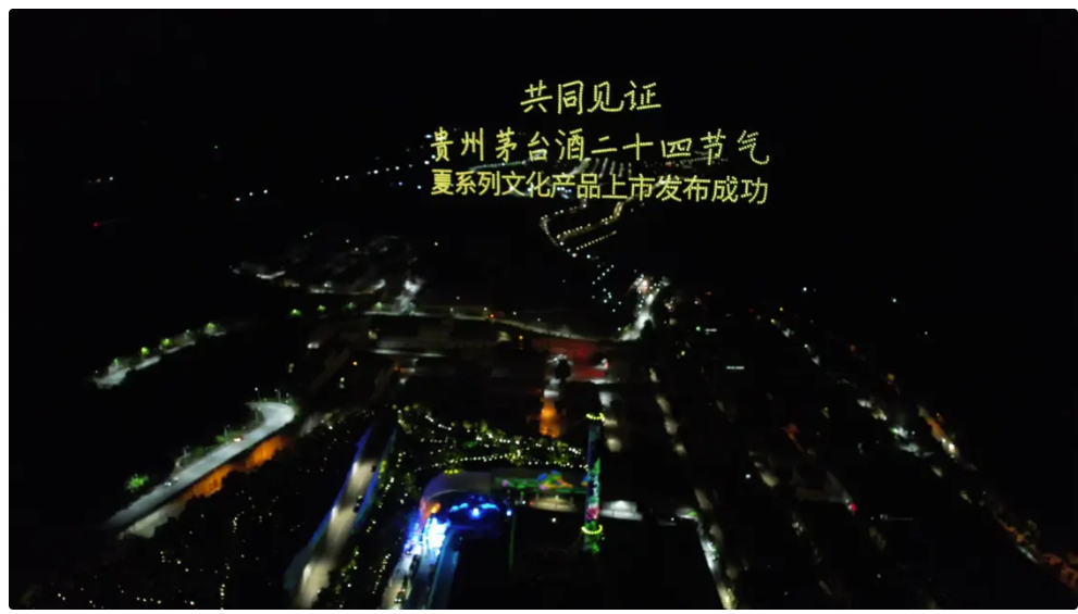 多架無人機(jī)以夜空為幕,在美輪美奐的燈光色彩配合下,小巽、茅臺酒瓶等造型和“共同見證貴州茅臺酒二十四節(jié)氣夏系列文化產(chǎn)品上市發(fā)布成功”等字樣依次呈現(xiàn),為與會人員獻(xiàn)上了一場精彩的視覺盛宴,更展示了茅臺品牌和文化的極致魅力。