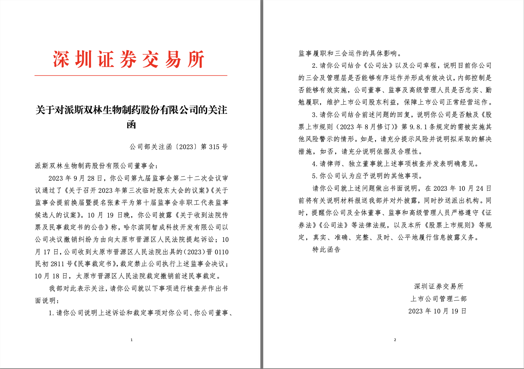 就在派林生物發(fā)布收到法院傳票及民事裁定書的公告當(dāng)晚,深交所火速向派林生物發(fā)布關(guān)注函,要求公司說明三會(huì)及管理層是否能夠有序運(yùn)作并形成有效決議,內(nèi)部控制是否能夠有效實(shí)施,公司董事、監(jiān)事及高級管理人員是否忠實(shí)、勤勉履職,維護(hù)上市公司股東利益,保障上市公司正常經(jīng)營運(yùn)作;同時(shí)還要求公司說明是否觸及相關(guān)規(guī)定的需被實(shí)施其他風(fēng)險(xiǎn)警示的情形。