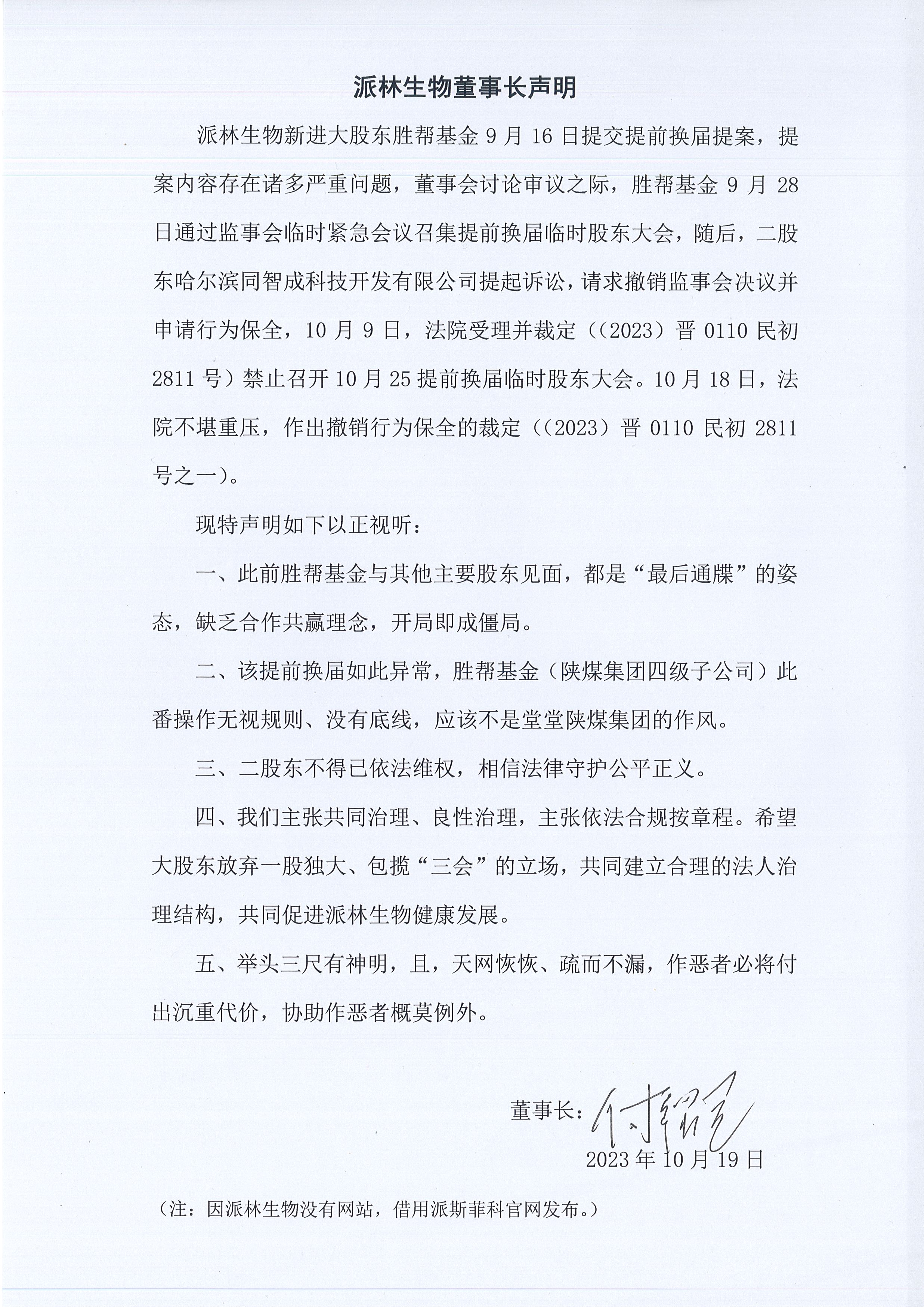 10月19日晚間,派林生物子公司派斯菲科發(fā)布了一則署名為派林生物董事長付紹蘭的聲明,對勝幫基金(即勝幫英豪)進(jìn)行了斥責(zé)。