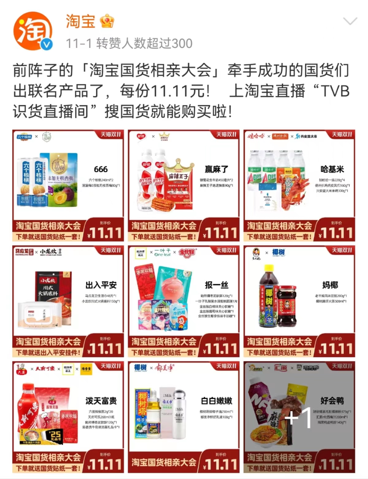 除了企業(yè)的互幫互助,淘寶、京東等多家電商平臺也積極創(chuàng)造國貨“被看見”的機會。9月份,淘寶上線“國貨超市”,推出好吃、好喝、好看、好用的國貨欄目,戴春林、活力28、黑芝麻、兩面針、蓮花味精等生活百貨均有推薦位;“雙11”期間,淘寶官方還親自下場組織“國貨相親大會”,促成郁美凈和椰樹的“白白嫩嫩”CP等,多家成功“牽手”的品牌還在直播間推出了“雙11”國貨聯(lián)名產品。