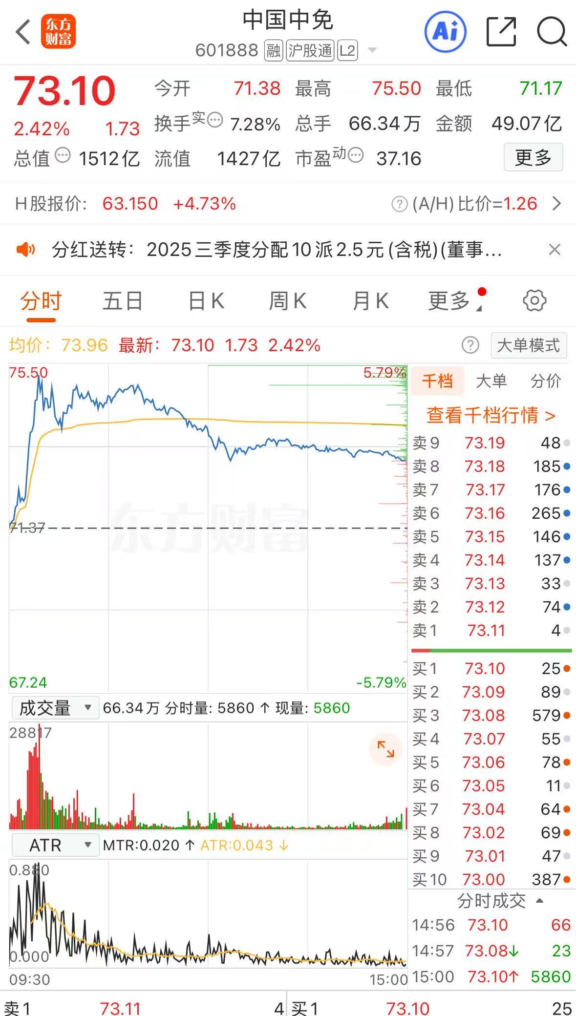 10月30日,A股市場(chǎng),中國(guó)中免一度沖高漲逾5%,截至收盤(pán),中國(guó)中免漲2.42%,報(bào)收73.10元/股;港股市場(chǎng),中國(guó)中免收漲4.73%,報(bào)收63.15港元/股。