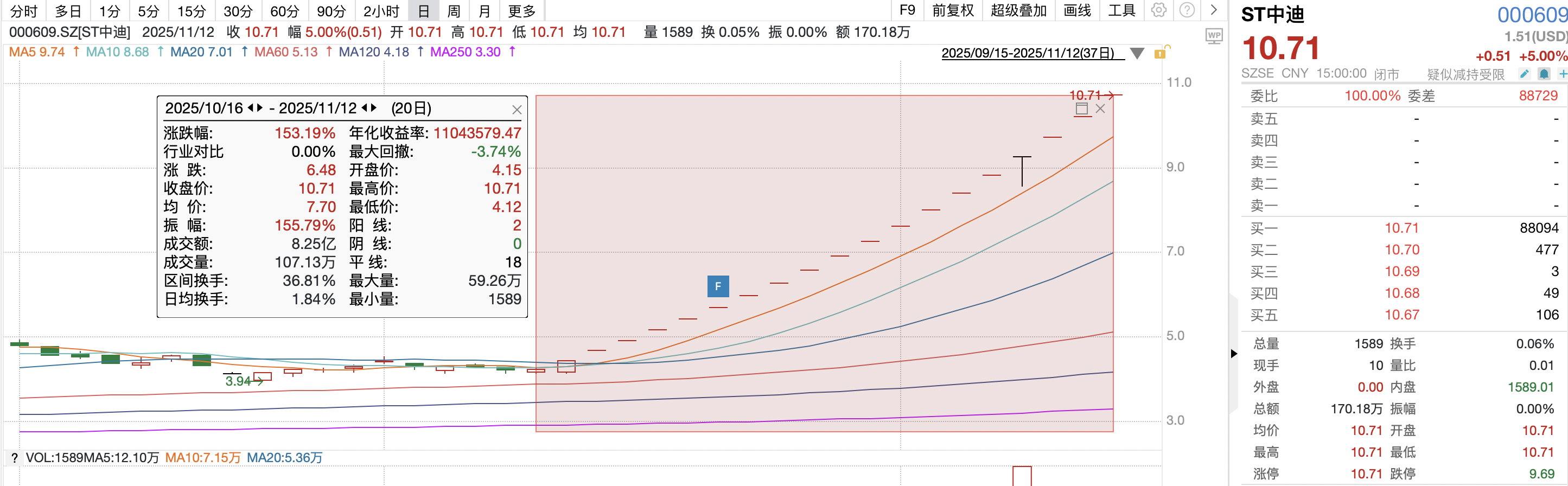 Wind數(shù)據(jù)顯示,ST中迪股價(jià)自10月16日至11月12日期間,累計(jì)漲幅高達(dá)153.19%,其間更是出現(xiàn)七次股價(jià)異常波動(dòng)。這種劇烈的股價(jià)波動(dòng)與公司基本面形成鮮明對(duì)比。截至11月11日,ST中迪靜態(tài)市盈率為-12.83倍,滾動(dòng)市盈率為-15.88倍,市凈率為-376.33倍,而同期中國(guó)上市公司協(xié)會(huì)行業(yè)分類房地產(chǎn)業(yè)的靜態(tài)市盈率為28.62倍,滾動(dòng)市盈率為26.19倍,市凈率為0.93倍。公司各項(xiàng)估值指標(biāo)與行業(yè)平均水平存在嚴(yán)重偏離,顯示出股價(jià)波動(dòng)嚴(yán)重背離公司基本面。