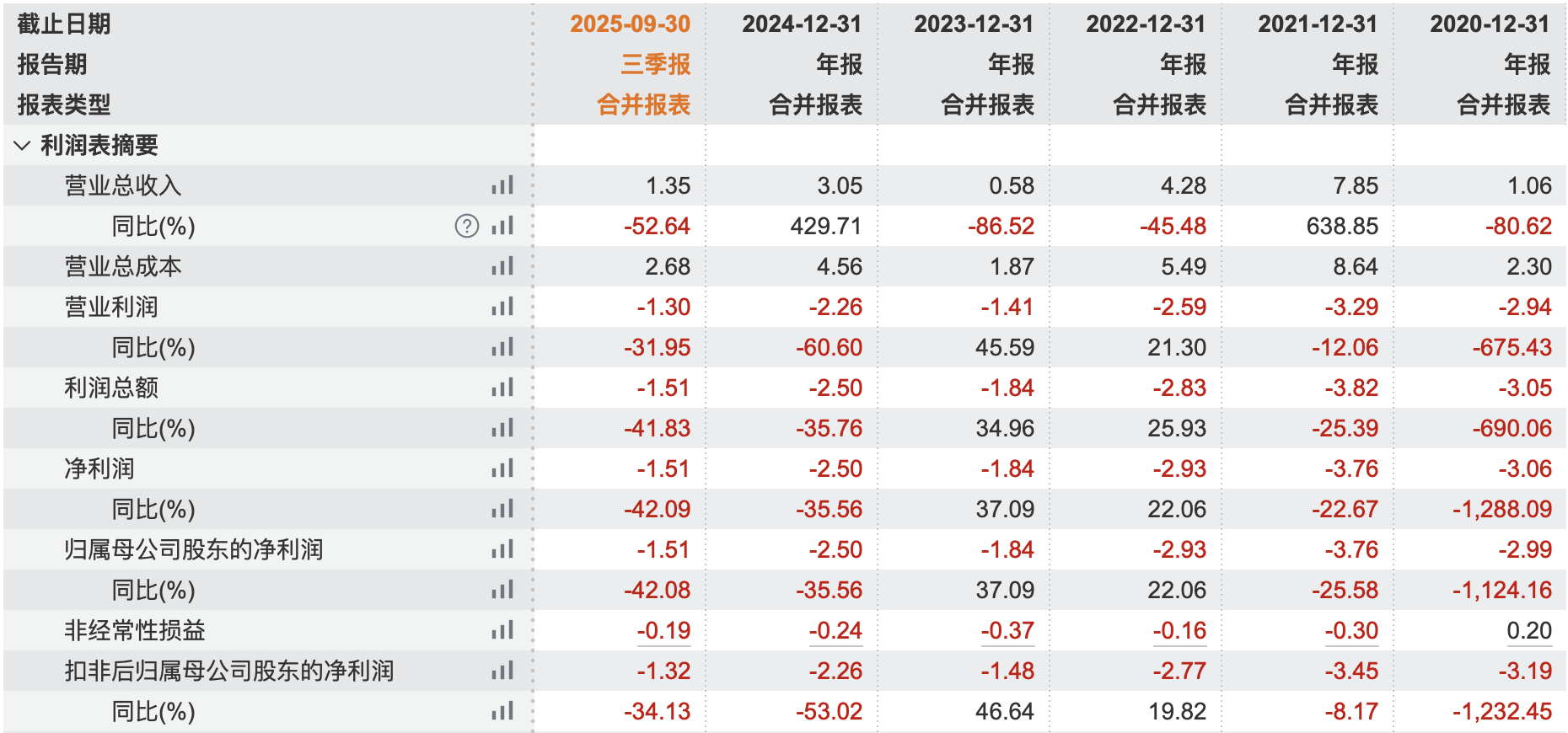 盡管股價(jià)大幅上漲,但ST中迪的經(jīng)營(yíng)狀況依然嚴(yán)峻。根據(jù)公司披露的財(cái)務(wù)數(shù)據(jù),2025年前三季度,該公司營(yíng)業(yè)收入為1.35億元,同比下降52.64%;利潤(rùn)總額為-1.51億元,同比下降41.83%。更為嚴(yán)峻的是,ST中迪2022年度、2023年度、2024年度三個(gè)會(huì)計(jì)年度扣除非經(jīng)常性損益前后凈利潤(rùn)孰低者均為負(fù)值,且2024年度審計(jì)報(bào)告顯示公司持續(xù)經(jīng)營(yíng)能力存在重大不確定性。這導(dǎo)致公司股票被繼續(xù)實(shí)施其他風(fēng)險(xiǎn)警示。