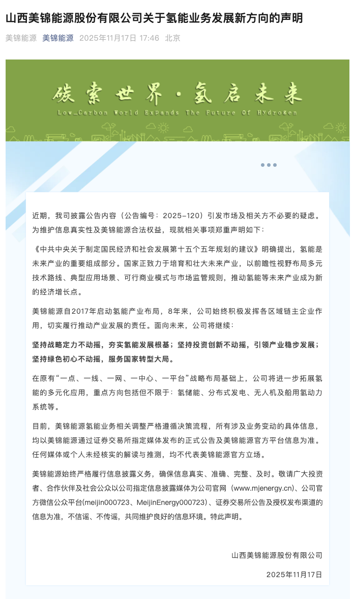 11月17日晚間,山西美錦能源股份有限公司(證券代碼:000723,證券簡(jiǎn)稱:美錦能源)在社交媒體發(fā)布聲明稱,該公司近期披露的一則公告內(nèi)容引發(fā)市場(chǎng)及相關(guān)方不必要的疑慮。為回應(yīng)各方關(guān)切,公司鄭重聲明,美錦能源自2017年啟動(dòng)氫能產(chǎn)業(yè)布局,8年來,公司始終積極發(fā)揮各區(qū)域鏈主企業(yè)作用,切實(shí)履行推動(dòng)產(chǎn)業(yè)發(fā)展的責(zé)任。面向未來,公司將繼續(xù):堅(jiān)持戰(zhàn)略定力不動(dòng)搖,夯實(shí)氫能發(fā)展根基;堅(jiān)持投資創(chuàng)新不動(dòng)搖,引領(lǐng)產(chǎn)業(yè)穩(wěn)步發(fā)展;堅(jiān)持綠色初心不動(dòng)搖,服務(wù)國家轉(zhuǎn)型大局。在原有“一點(diǎn)、一線、一網(wǎng)、一中心、一平臺(tái)”戰(zhàn)略布局基礎(chǔ)上,公司將進(jìn)一步拓展氫能的多元化應(yīng)用,重點(diǎn)方向包括但不限于:氫儲(chǔ)能、分布式發(fā)電、無人機(jī)及船用氫動(dòng)力系統(tǒng)等。