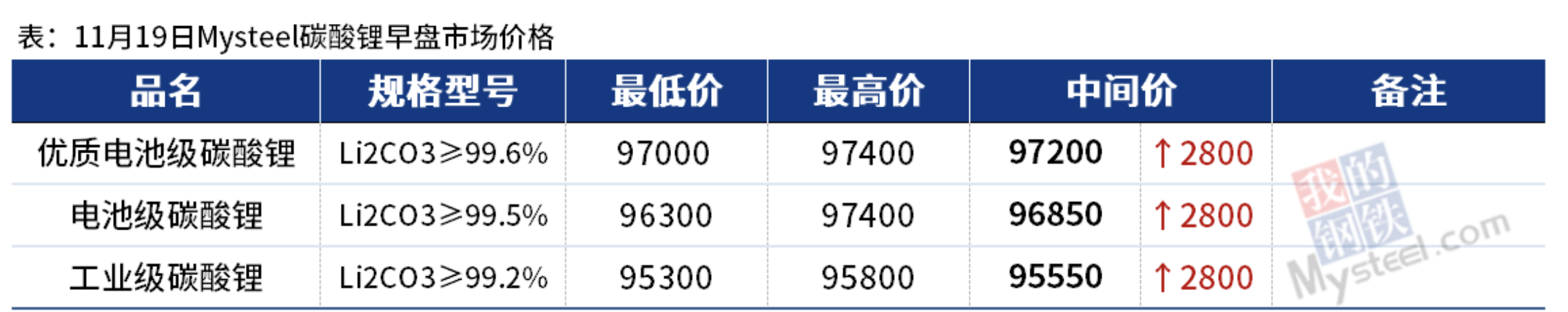 現(xiàn)貨市場上,上海鋼聯(lián)11月19日發(fā)布數(shù)據(jù)顯示,今日電池級(jí)碳酸鋰(早盤)價(jià)格較昨日上漲2800元/噸,中間價(jià)報(bào)96850元/噸。