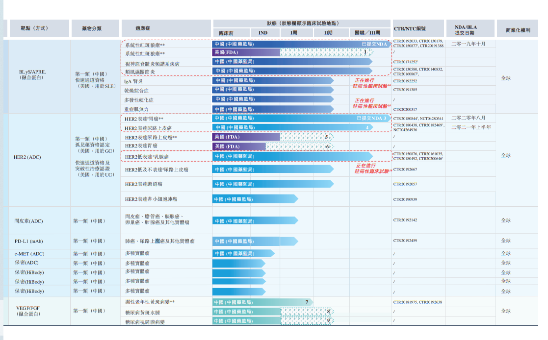 榮昌生物由榮昌制藥和房健民博士于2008年創(chuàng)立,是一家致力于發(fā)現(xiàn)、開發(fā)和商業(yè)化全球“同類首創(chuàng)”、“同類最佳”生物藥物的一流創(chuàng)新性藥企。通過持續(xù)創(chuàng)新,成功打造出一個包括抗體和融合蛋白平臺、抗體偶聯(lián)藥物平臺、雙功能抗體平臺等三大平臺在內(nèi)的世界級自主創(chuàng)新研發(fā)引擎,成為中國生物醫(yī)藥界的一匹“黑馬”。目前,公司在自身免疫、腫瘤、眼科等重大疾病領(lǐng)域已開發(fā)10余款全球首創(chuàng)、同類領(lǐng)先的在研生物藥,其中5款產(chǎn)品針對17種適應(yīng)癥正在進行臨床試驗,尤其是泰它西普(商品名:泰愛)、維迪西妥單抗(商品名:愛地希)兩款新藥的臨床數(shù)據(jù)全球領(lǐng)先,舉世矚目,已在國內(nèi)提交上市申請,并將很快獲批上市。