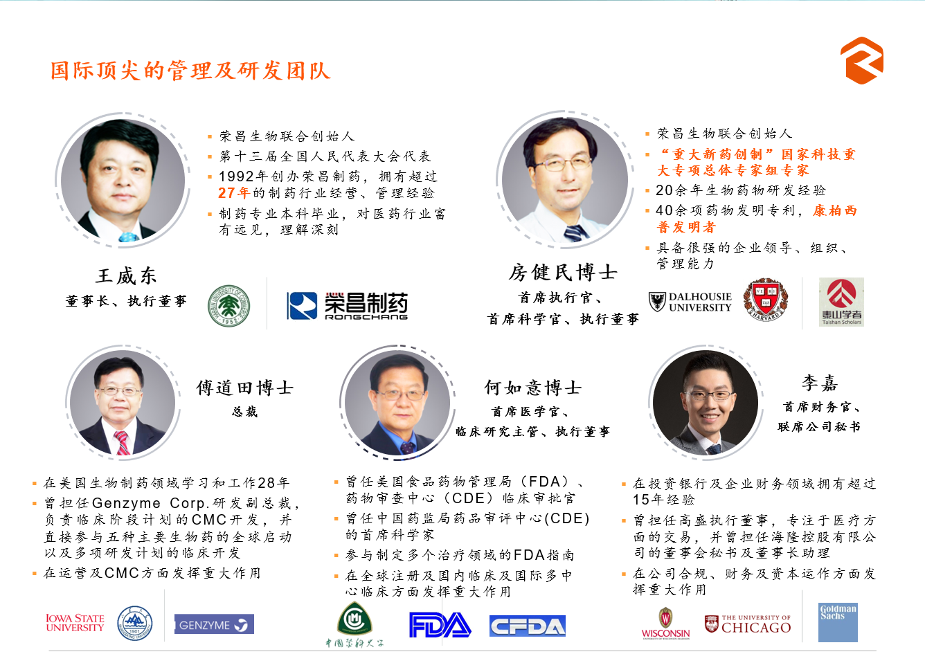 榮昌生物領(lǐng)先全球的研發(fā)管線背后,站著一個超級耀眼的明星團隊。除榮昌生物聯(lián)合創(chuàng)始人、CEO兼CSO房健民博士外,公司其他高管在諸如創(chuàng)新藥物研發(fā)、臨床開發(fā)、商業(yè)化等方面也都擁有成功經(jīng)驗。榮昌生物聯(lián)合創(chuàng)始人、董事長王威東,擁有超過30年的制藥行業(yè)經(jīng)營、管理經(jīng)驗,于1993年創(chuàng)立煙臺榮昌制藥股份有限公司,這是一家從事傳統(tǒng)中藥開發(fā)、生產(chǎn)及銷售的中國制藥公司,旗下?lián)碛懈靥┑戎放?。公司首席醫(yī)學官何如意博士是中國藥品臨床研發(fā)及全球監(jiān)管制度領(lǐng)域的權(quán)威專家,曾在美國FDA任職17年,之后被中國藥監(jiān)局以首席科學家身份特邀回國,熟知中國、美國及其他國家和地區(qū)的監(jiān)管審查規(guī)定及審批程序,在擔任國家藥監(jiān)局藥品審評中心首席科學家期間推動了中國多項重要的藥政改革。公司總裁傅道田博士在國際生物藥研發(fā)、項目與人員管理,包括生產(chǎn)工藝設(shè)計和研發(fā),分析平臺建立,質(zhì)量標準認定和國際申報上擁有20多年的豐富經(jīng)驗,曾任麗珠醫(yī)藥副總裁及執(zhí)行董事,擔任過美國著名生物醫(yī)藥公司健贊研發(fā)副總裁,直接參與過5種主要生物藥的全球上市以及多項開發(fā)項目的臨床開發(fā)。