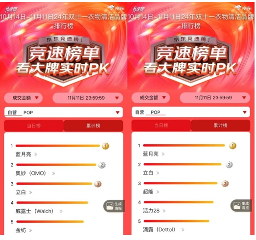 在京東平臺,藍(lán)月亮占據(jù)了11月11日24年雙十一衣物清潔品牌自營、POP當(dāng)日榜的雙料榜首,還是10月14日至11月11日衣物清潔品牌自營、POP累計榜榜首。