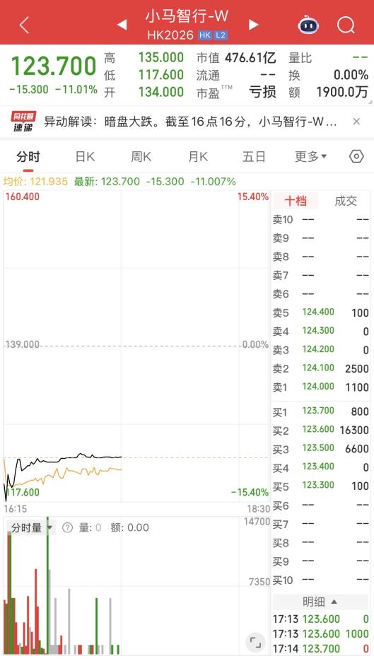 本報訊 (記者袁傳璽)11月5日,小馬智行-W(以下簡稱“小馬智行”)港股暗盤開盤跌超15%,截至17:15,跌幅收窄至11.01%,報價123.7港元/股。據(jù)了解,小馬智行確定全球發(fā)售最終發(fā)售價為每股139.00港元,全球發(fā)售所得款項總額(未扣除包銷費用及開支)預計約67.1億港元。