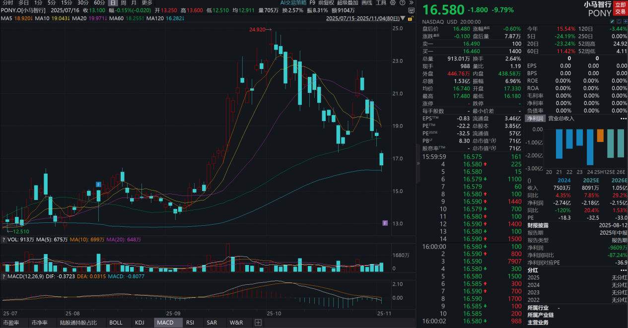 數(shù)據(jù)顯示,美國當?shù)貢r間周二(11月4日),美股三大股指全線收跌,受整體環(huán)境影響,小馬智行大跌9.79%,盤中最大跌幅達11.89%,收盤價為16.58美元/股,這也是小馬智行連續(xù)5個交易日下跌,累計下跌幅度達24.19%。同期,另一家自動駕駛公司文遠知行,美股股價也累計下跌19.75%。