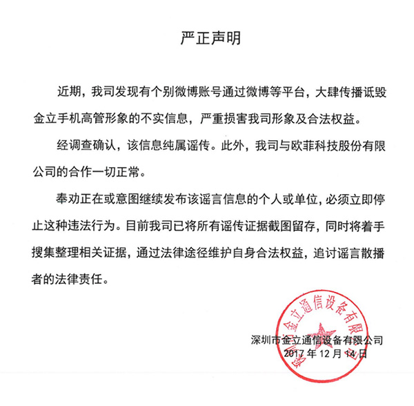 “經(jīng)調(diào)查確認(rèn),該消息純屬謠傳,此外,我司與歐菲科技股份有限公司的合作一切正常。”金立同時(shí)稱,公司已將所有謠傳證據(jù)截圖留存,計(jì)劃用法律途徑維護(hù)自身合法權(quán)益。