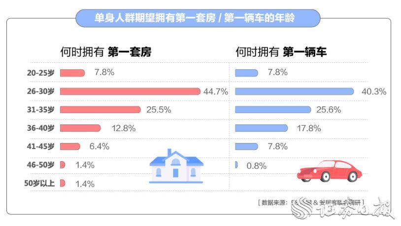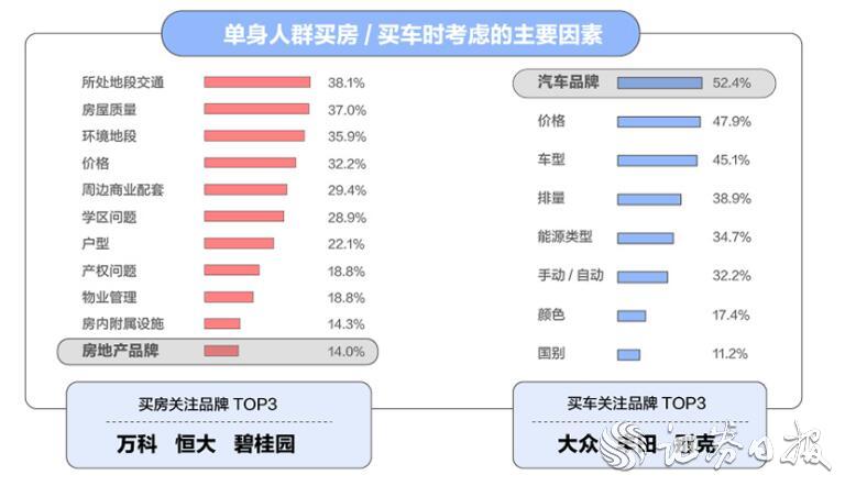 58安居客房產(chǎn)研究院和58同城二手車研究院聯(lián)合調(diào)研數(shù)據(jù)顯示,六成單身未婚人群在置業(yè)選擇上傾向于先買房再買車。不論是先買房還是先買車,都有超過40%的單身人群希望在26-30歲之間擁有屬于自己的房和車。從買房/買車時(shí)考慮的主要因素來看,僅有14%的單身受訪者選擇“房地產(chǎn)品牌”,而把“汽車品牌”納入主要考慮因素的單身消費(fèi)者則達(dá)到了52.4%。
