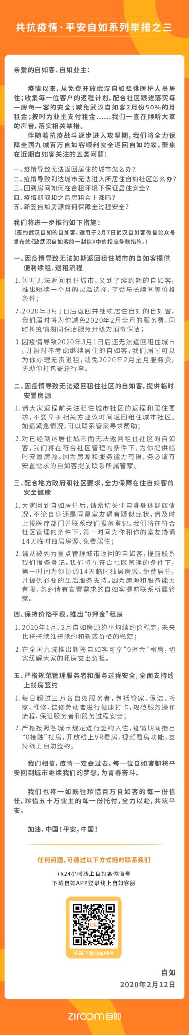 此前,自如已陸續(xù)發(fā)布多項(xiàng)針對(duì)疫情的應(yīng)對(duì)舉措,包括2月7日,武漢自如發(fā)出《致武漢自如客的一封信》,宣布減免武漢自如客2月50%的租金及2月全月服務(wù)費(fèi)等措施;開(kāi)放武漢自如驛供醫(yī)護(hù)人員居住,配合社區(qū)防控、協(xié)助相關(guān)政府部門(mén)收集租客返程信息,按時(shí)為業(yè)主支付租金等。