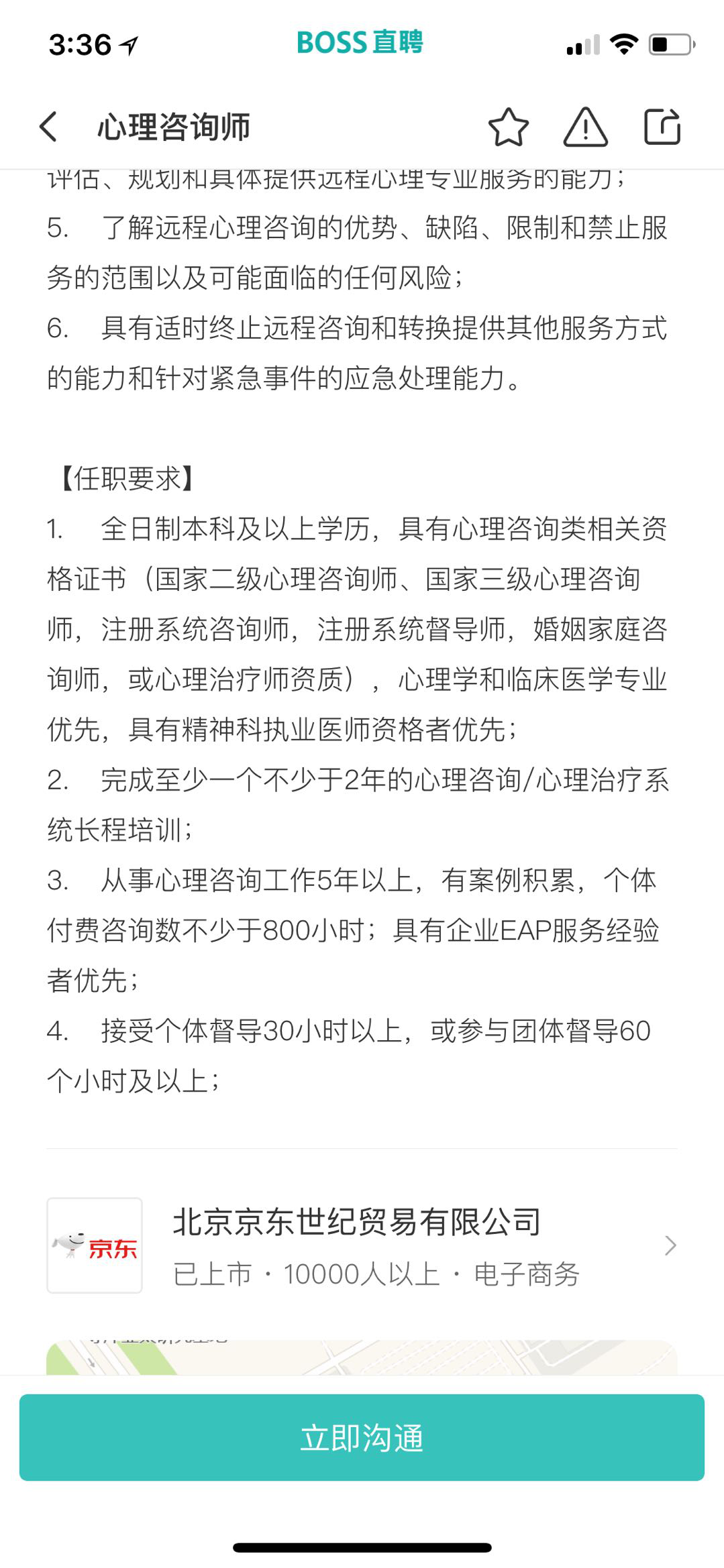 心理學專業(yè)畢業(yè)的楊雪已經面試了十五份工作。她之前也面試過心理咨詢師這樣的崗位,可相關崗位卻需要有工作經驗的人才。因為咨詢師的崗位往往會對咨詢時間、咨詢量提出要求。作為畢業(yè)生,楊雪并不符合這樣的要求,“想要月薪過萬,基本都需要國家級的資質證書、系統(tǒng)的咨詢培訓經驗和上百小時的咨詢經驗。”