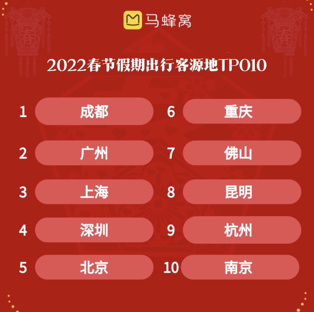 南方游客最愛出門玩,成都是春節(jié)假期的最強(qiáng)客源地城市。其余上榜的客源地,只有北京一個北方城市進(jìn)入前十,廣州、上海、深圳、重慶、佛山、昆明、杭州、南京等城市彰顯了過年期間南方旅游消費(fèi)的強(qiáng)勁。