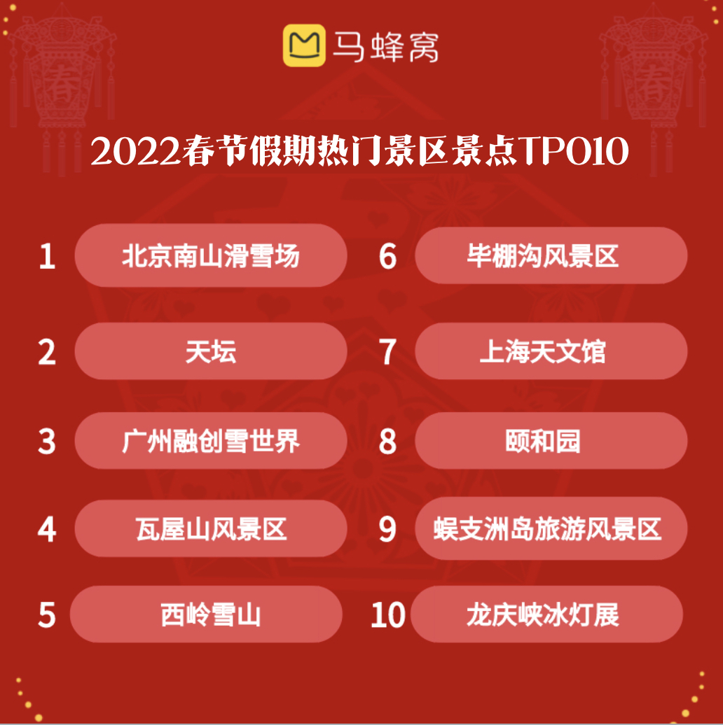 大年初四,萬眾矚目的第24屆冬季奧林匹克運(yùn)動會開幕式在北京成功舉辦。“奧運(yùn)場館”、“張家口”等冬奧相關(guān)數(shù)據(jù)的瞬時搜索量在馬蜂窩平臺上暴漲400%,冰雪相關(guān)的景區(qū)景點(diǎn)在春節(jié)玩樂榜單中占據(jù)多席。北京的南山滑雪場位居熱門景區(qū)榜首,頤和園的昆明湖化身超大冰場,五花八門的冰上玩樂項(xiàng)目成為了在北京過年的人們的好去處。廣州的融創(chuàng)雪世界則用一場雪地醒獅表演開啟首屆“灣區(qū)冰雪文化節(jié)”,用嶺南特有的文化表演喜迎冬奧。活動當(dāng)日,融創(chuàng)雪世界熱度上漲40%,一舉沖入熱門景區(qū)榜單前三,成為南方地區(qū)春節(jié)期間熱度最高的冰雪旅游景點(diǎn)。