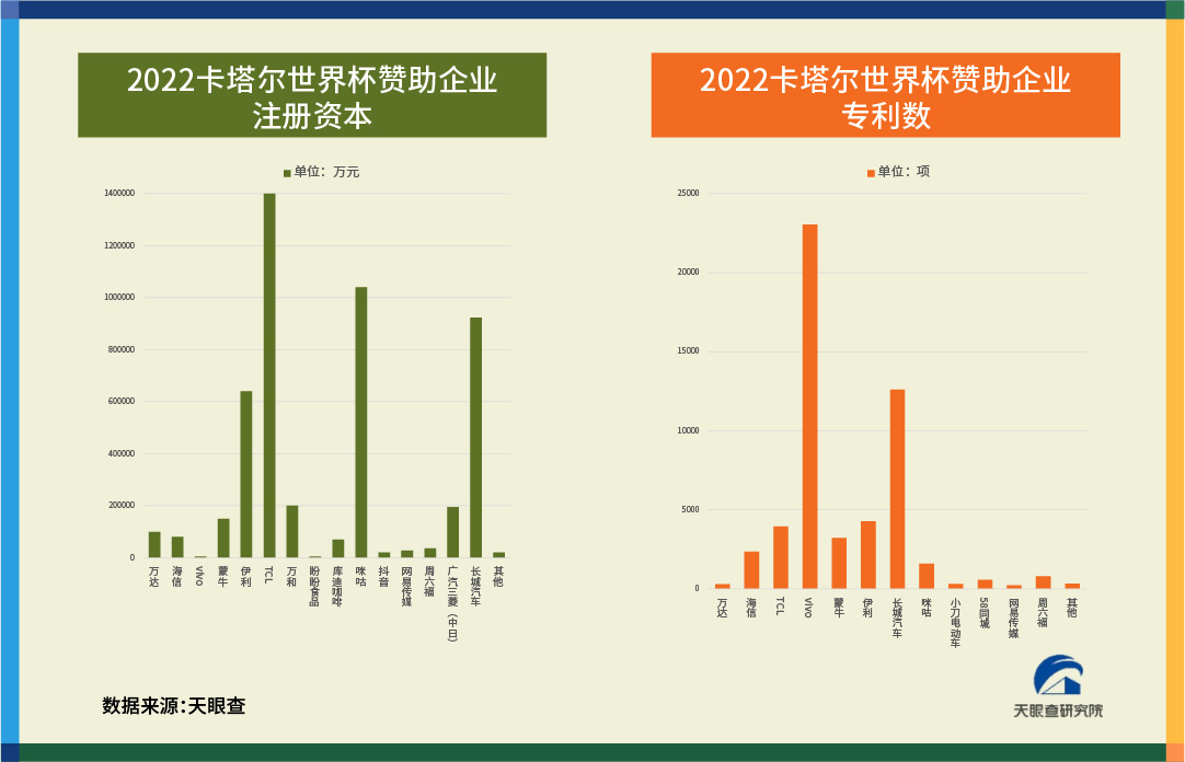 贊助世界杯的企業(yè)中,不乏注冊資本雄厚者。據(jù)天眼查數(shù)據(jù)顯示,TCL、咪咕、長城汽車三家企業(yè)注冊資本位居前三。其中,攜手巴西隊征戰(zhàn)世界杯的智能制造科技企業(yè)TCL注冊資本高達(dá)140.3億元,可以購買7000萬個世界杯紀(jì)念足球,鋪滿約1500個足球場。