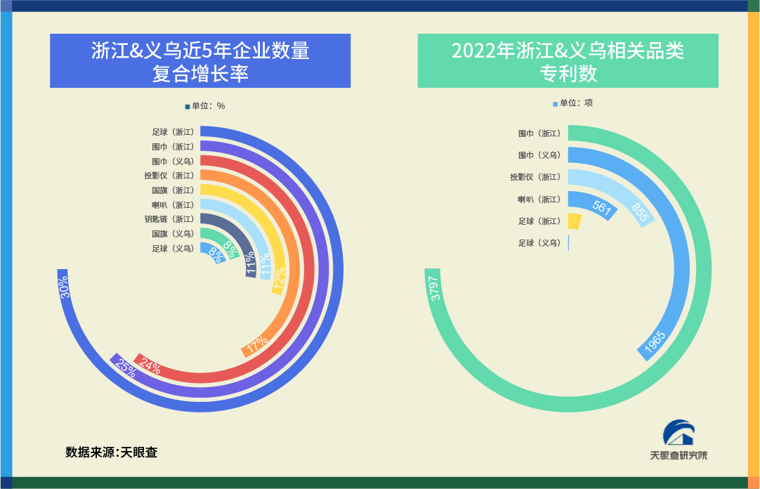 同時,研發(fā)能力近年來成為“義烏制造”的重要名片。近年來,義烏小商品制造業(yè)企業(yè)深耕產(chǎn)業(yè)鏈,自主知識產(chǎn)權(quán)保護(hù)意識不斷上升。為獲得更高質(zhì)量的訂單,義烏商家們不僅研發(fā)出外觀專利,創(chuàng)立自己的品牌,而且根據(jù)不同國家球迷的需求設(shè)計周邊產(chǎn)品,提升產(chǎn)品的市場外向性。今年世界杯恰遇北半球冬季,保暖用品需求顯著上升。天眼查數(shù)據(jù)顯示,僅“圍巾”品類,義烏企業(yè)就擁有1965項專利。