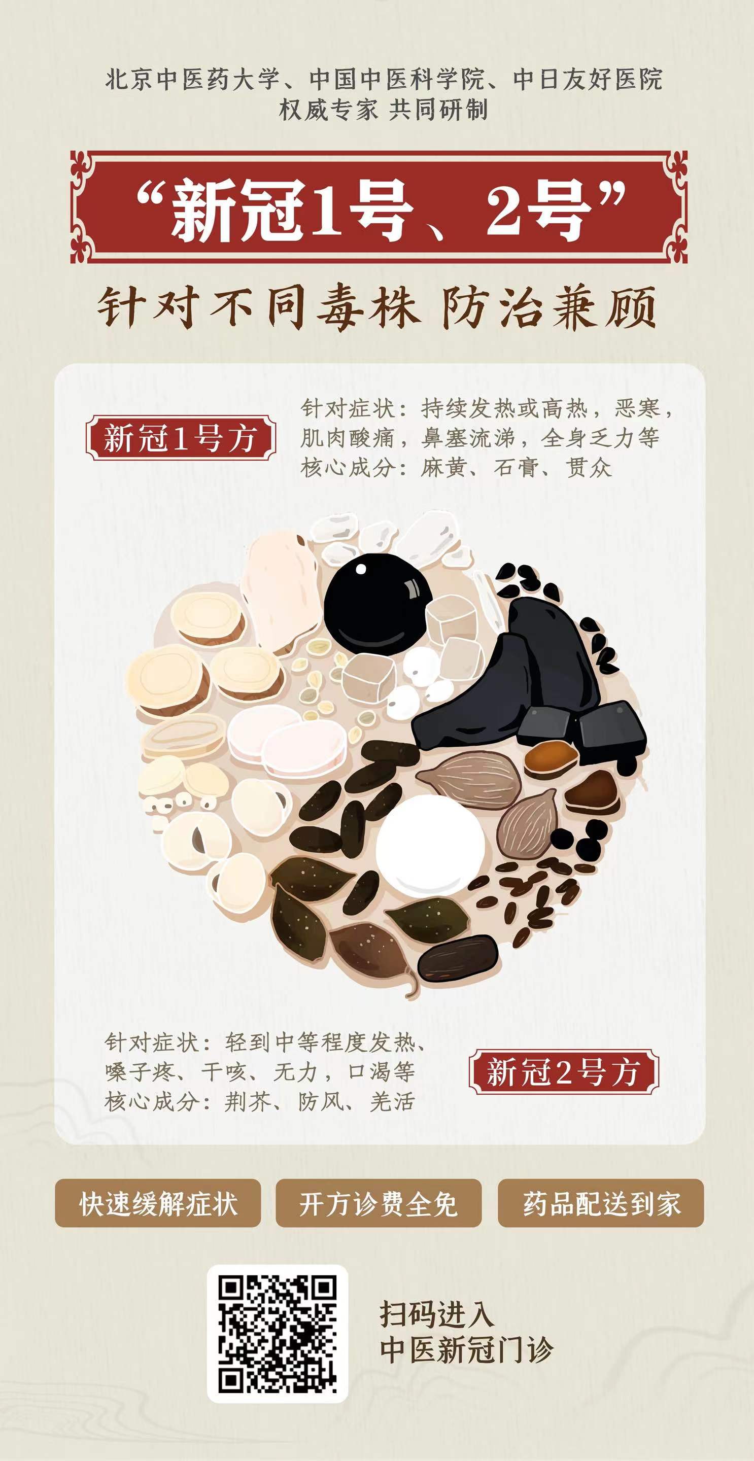 由北京中醫(yī)藥大學(xué)、中國中醫(yī)科學(xué)院、中日友好醫(yī)院三位著名中醫(yī)專家聯(lián)合推出的新冠1號、新冠2號中藥方劑來了,“全國居家醫(yī)療保障平臺”中醫(yī)新冠門診專業(yè)醫(yī)生在線提供對癥治療。