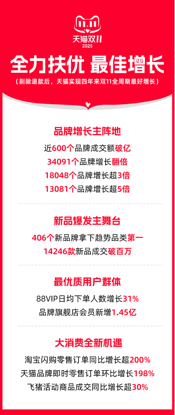 今年以來,天貓?zhí)岢鋈Ψ龀謨?yōu)質(zhì)品牌和原創(chuàng)商家,投入戰(zhàn)略級資源做大品牌增長。2025年天貓“雙11”,天貓實(shí)現(xiàn)了四年來“雙11”全周期最好的一次增長。天貓始終是優(yōu)質(zhì)品牌商家的增長主陣地,天貓“雙11”始終是優(yōu)質(zhì)品牌商家全年最重要的增長機(jī)會(huì)。