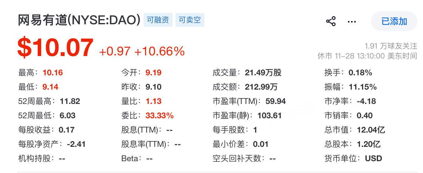 本報訊 (記者袁傳璽)美東時間上一個交易日,網(wǎng)易有道(NYSE:DAO)股價強勢拉升,截至收盤大漲10.66%,報收10.07美元/股,公司總市值12.04億美元。
