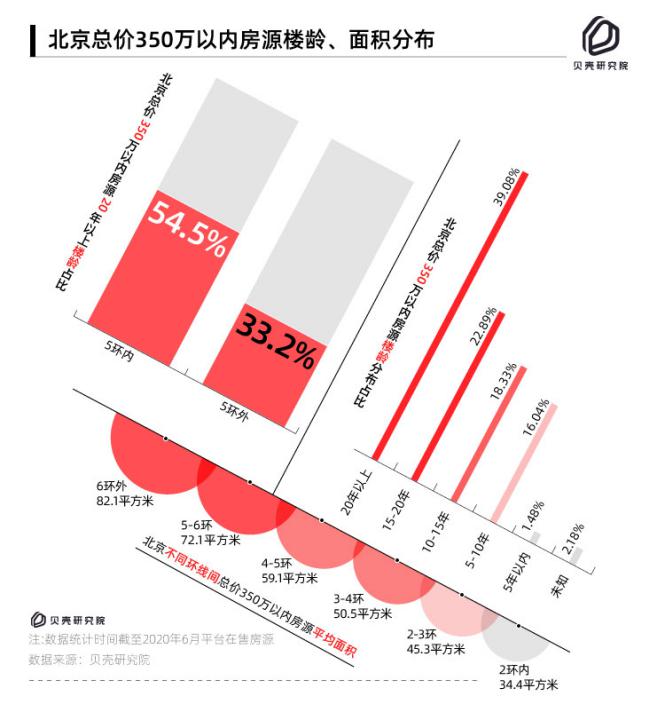 貝殼研究院數(shù)據(jù)顯示,北京總價350萬元以內(nèi)的房源平均面積69.58平方米,近四成房齡在20年以上??們r350萬元以內(nèi)房源中,五環(huán)內(nèi)房齡20年以上的房源占54.5%,而這一比例在五環(huán)外僅為33.2%;六環(huán)外房源平均面積達82平方米,而二環(huán)內(nèi)僅為34.4平方米。越往外圍符合剛需們的房源越多,但這并不意味著在五環(huán)內(nèi)剛需們就沒有了選擇,只是很大可能要在房齡、面積等條件上做讓步。