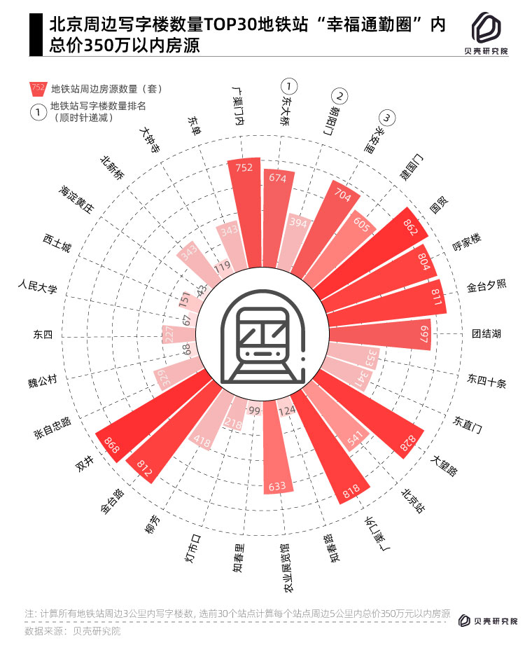 從家門口到地鐵站的路程影響居住出行,而從家門口到公司的距離則決定能否實現(xiàn)“幸福通勤”。貝殼研究院以職住距離小于5公里作為幸福通勤的標(biāo)準(zhǔn),假設(shè)寫字樓多的地方工作機會也多,選出周邊3公里內(nèi)寫字樓數(shù)量最多的30個地鐵站為目的地,再以每個地鐵站為中心劃出5公里“幸福通勤圈”。