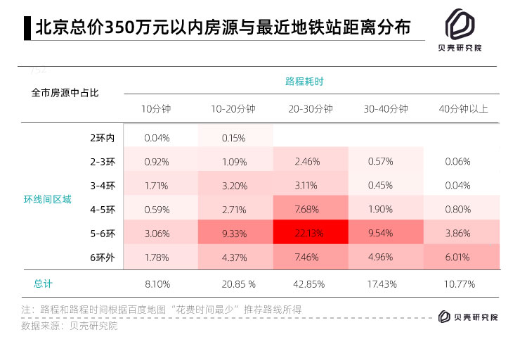 對于上班族而言,出行便利、職住通勤距離是必須要考慮的因素。貝殼研究院計算了總價350萬元以內(nèi)所有房源到其最近地鐵站的路程和所需時間,僅10.8%的房源距離最近地鐵站的路程在1公里以內(nèi),28.95%的房源距離最近地鐵站路程耗時在20分鐘以內(nèi)。