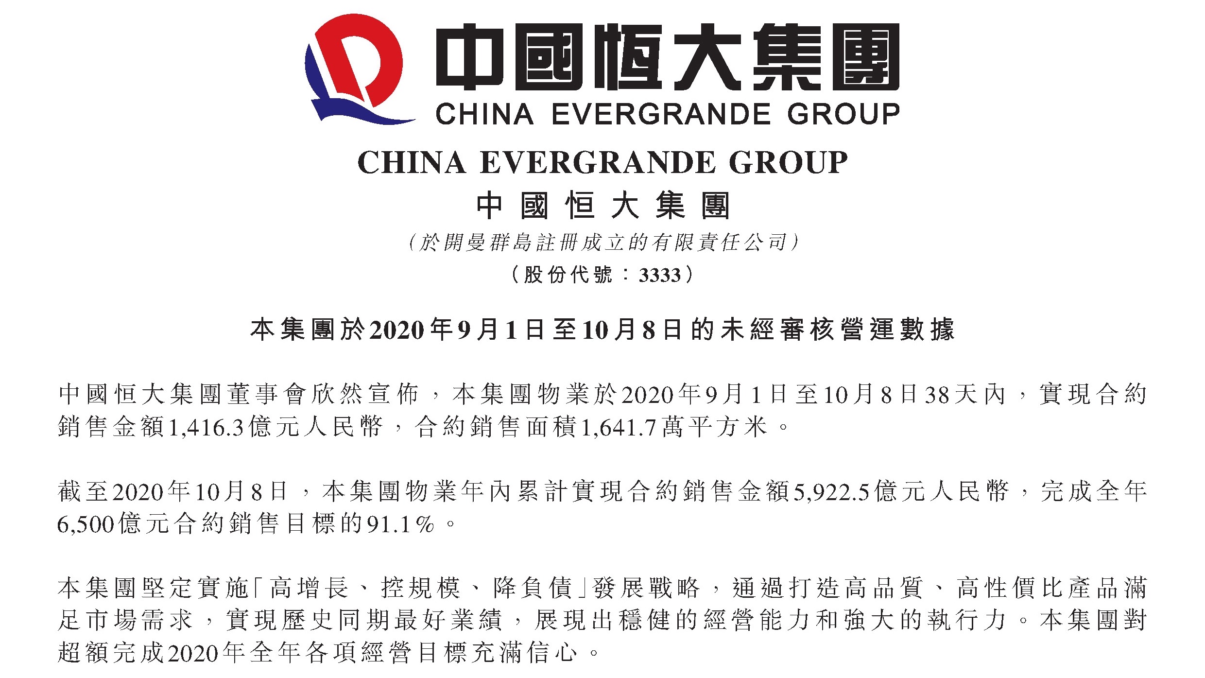 截至10月8日,恒大累計(jì)實(shí)現(xiàn)銷售5922.5億元,完成全年6500億銷售目標(biāo)91%,本月底提前完成全年目標(biāo)已無懸念,并大概率完成全年8000億元內(nèi)控銷售目標(biāo)。