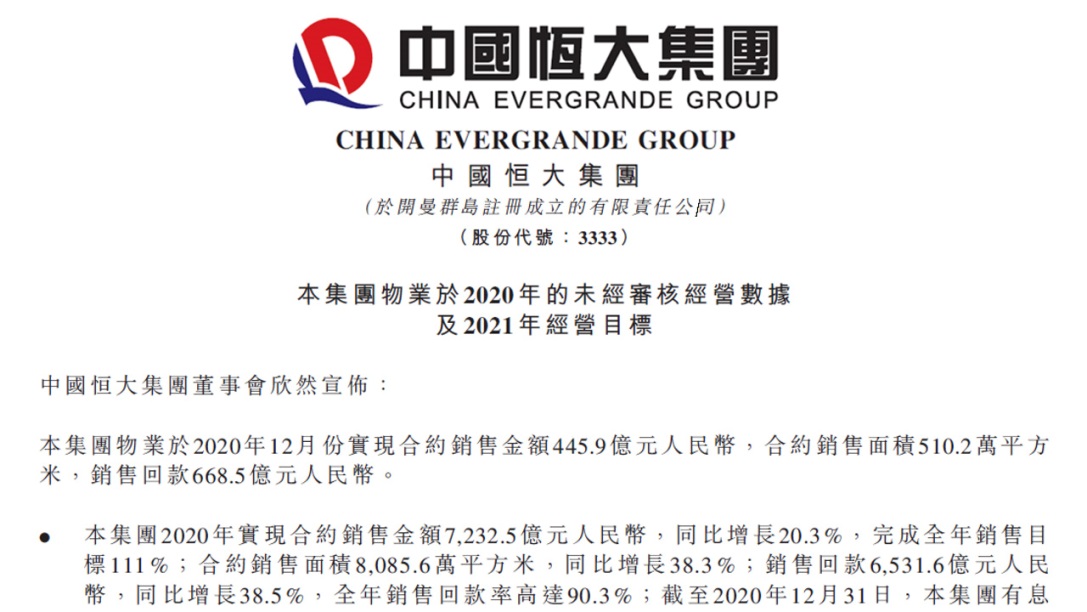 1月5日,中國(guó)恒大(3333.HK)發(fā)布公告稱,2020年全年集團(tuán)實(shí)現(xiàn)銷售7232.5億元,同比增長(zhǎng)20.3%,完成全年銷售目標(biāo)111%;銷售面積8085.6萬(wàn)平方米,同比增長(zhǎng)38.3%;銷售回款6531.6億元,同比增長(zhǎng)38.5%,全年回款率90.3%。
