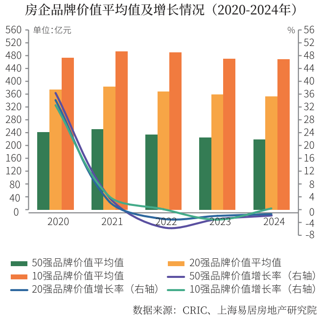 從2020-2024年房地產(chǎn)企業(yè)品牌價(jià)值測評結(jié)果看,企業(yè)品牌價(jià)值總體繼續(xù)下降,但降幅收窄。具體來看,2024年50強(qiáng)品牌價(jià)值均值由上年的225億元回落至219億元,同比下降2.51%,20強(qiáng)的品牌價(jià)值均值由上年的360億元回落至353億元,同比下降1.95%,10強(qiáng)的品牌價(jià)值均值由上年的470億元回落至469億元,同比下降0.17%。