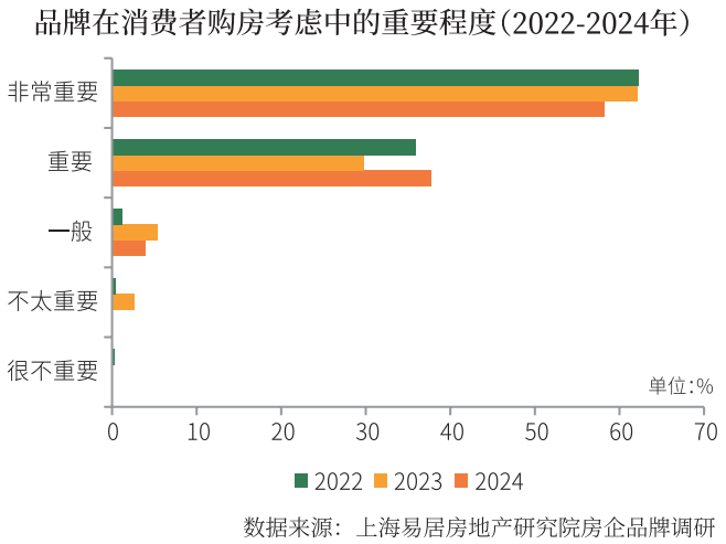 2024年消費(fèi)端調(diào)研結(jié)果顯示,品牌在消費(fèi)者購房行為中起著重大的影響。2024年,在消費(fèi)者對房企品牌重視程度方面,選擇非常重要的占比達(dá)58.28%,選擇重要的占比為37.70%,兩者之和較上年提升4.09個(gè)百分點(diǎn),選擇一般的占比4.02%,較上年下降1.39個(gè)百分點(diǎn),不太重要、很不重要的占比均為0。