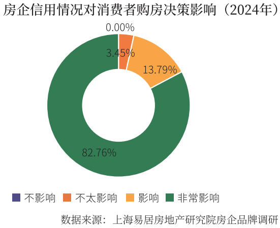 從2024年的消費(fèi)者調(diào)研來看,房企的信用情況依舊受到消費(fèi)者重點(diǎn)關(guān)注。在被問及如果開發(fā)商有債務(wù)違約等信用及財(cái)務(wù)風(fēng)險(xiǎn)情況,是否會(huì)影響購房決策時(shí),全部消費(fèi)者認(rèn)為開發(fā)商的信用及財(cái)務(wù)風(fēng)險(xiǎn)會(huì)影響其購房決策。其中,82.76%的消費(fèi)者認(rèn)為非常影響,此比例較上年上升20.60個(gè)百分點(diǎn)。不太影響的占比為3.45%,較上年下降4.66個(gè)百分點(diǎn)。2024年房地產(chǎn)市場繼續(xù)處在低位調(diào)整,置業(yè)者對市場的預(yù)期走低,置業(yè)信心不足觀望情緒濃厚,對房企的信用敏感度遠(yuǎn)勝以往。