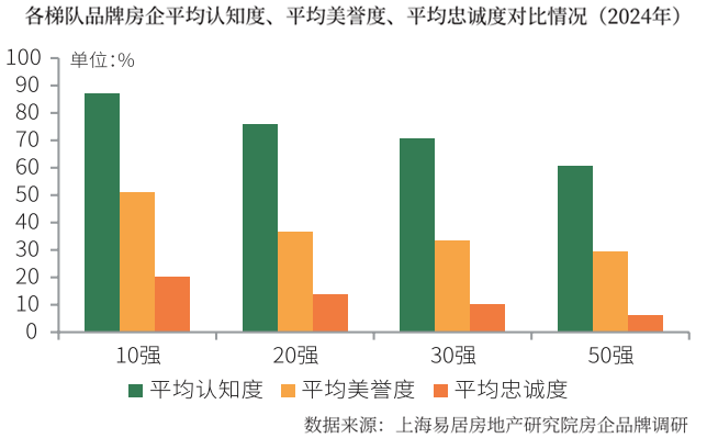 連續(xù)五年通過消費(fèi)者調(diào)研,從認(rèn)知度、美譽(yù)度和忠誠度三個(gè)維度分析房企的品牌特征。2024年50強(qiáng)品牌房企的平均認(rèn)知度、美譽(yù)度和忠誠度均有所下降。調(diào)研結(jié)果顯示,2024年50強(qiáng)品牌房企平均認(rèn)知度為60.62%,較上年減少4.75個(gè)百分點(diǎn)。平均美譽(yù)度為29.61%,較上年減少0.06個(gè)百分點(diǎn);平均忠誠度繼續(xù)下降,僅為6.37%。
