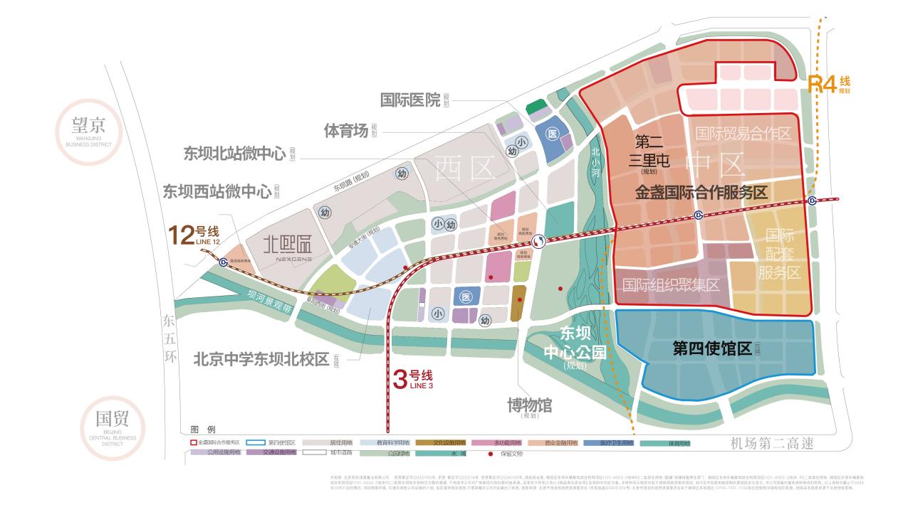 東壩的崛起并非偶然,而是戰(zhàn)略布局與政策扶持共同推動(dòng)的結(jié)果。自2014年被納入“十二五”時(shí)期十大重點(diǎn)發(fā)展區(qū)域后,東壩便承載起朝陽(yáng)區(qū)城市功能疏解與升級(jí)的重任。2019年,《東壩北西區(qū)域項(xiàng)目控制性詳細(xì)規(guī)劃方案》的通過(guò)明確了區(qū)域發(fā)展路徑;2020年,金盞國(guó)際合作服務(wù)區(qū)納入自貿(mào)試驗(yàn)區(qū)國(guó)際商務(wù)服務(wù)片區(qū),使東壩與國(guó)貿(mào)CBD并列為“自貿(mào)雙核”,戰(zhàn)略地位顯著躍升;2023年10月份,《金盞中區(qū)街區(qū)控規(guī)》的正式發(fā)布,標(biāo)志著金盞國(guó)際合作服務(wù)區(qū)與第四使館區(qū)的建設(shè)邁入新階段。金盞國(guó)際合作服務(wù)區(qū)中區(qū)南部緊鄰第四使館區(qū),定位為“國(guó)際交往新主場(chǎng),生態(tài)宜游新都會(huì)”;2024年1月21日,北京市第十六屆人民代表大會(huì)的政府工作報(bào)告中明確提出實(shí)施新一輪的三年發(fā)展計(jì)劃,推動(dòng)第四使館區(qū)建設(shè)。這意味著,三年內(nèi),第四使館區(qū)將具備投入使用的條件。