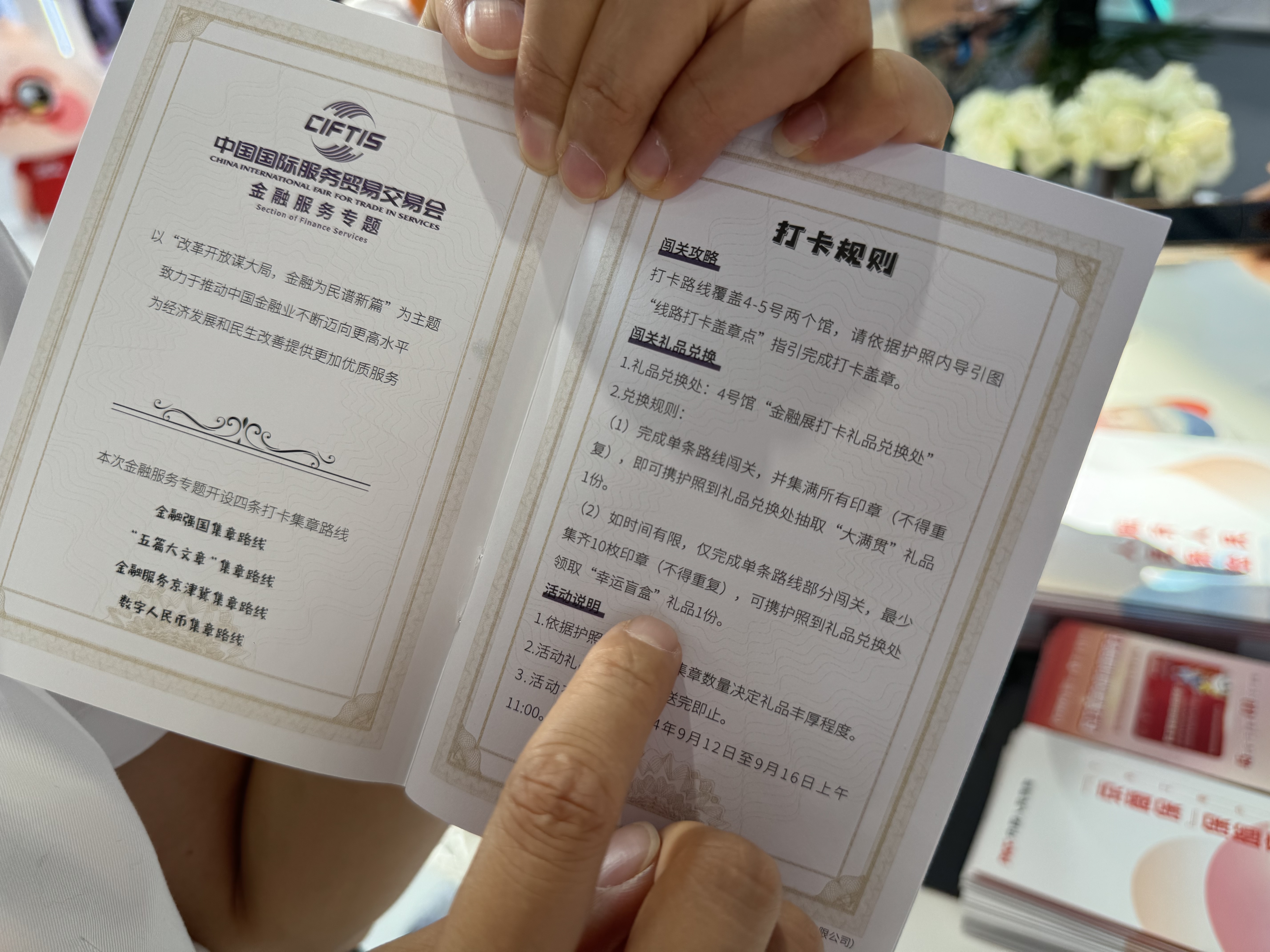 當(dāng)天上午,《證券日?qǐng)?bào)》記者來(lái)到金融服務(wù)專題展區(qū)注意到,在“金融展打卡護(hù)照領(lǐng)取處”聚集了眾多參觀者,相關(guān)工作人員介紹:“參觀者可免費(fèi)領(lǐng)取護(hù)照,在金融展內(nèi)進(jìn)行City Walk打卡集章活動(dòng),一共有4條路線,完成單獨(dú)路線闖關(guān)后即可兌換禮品。”