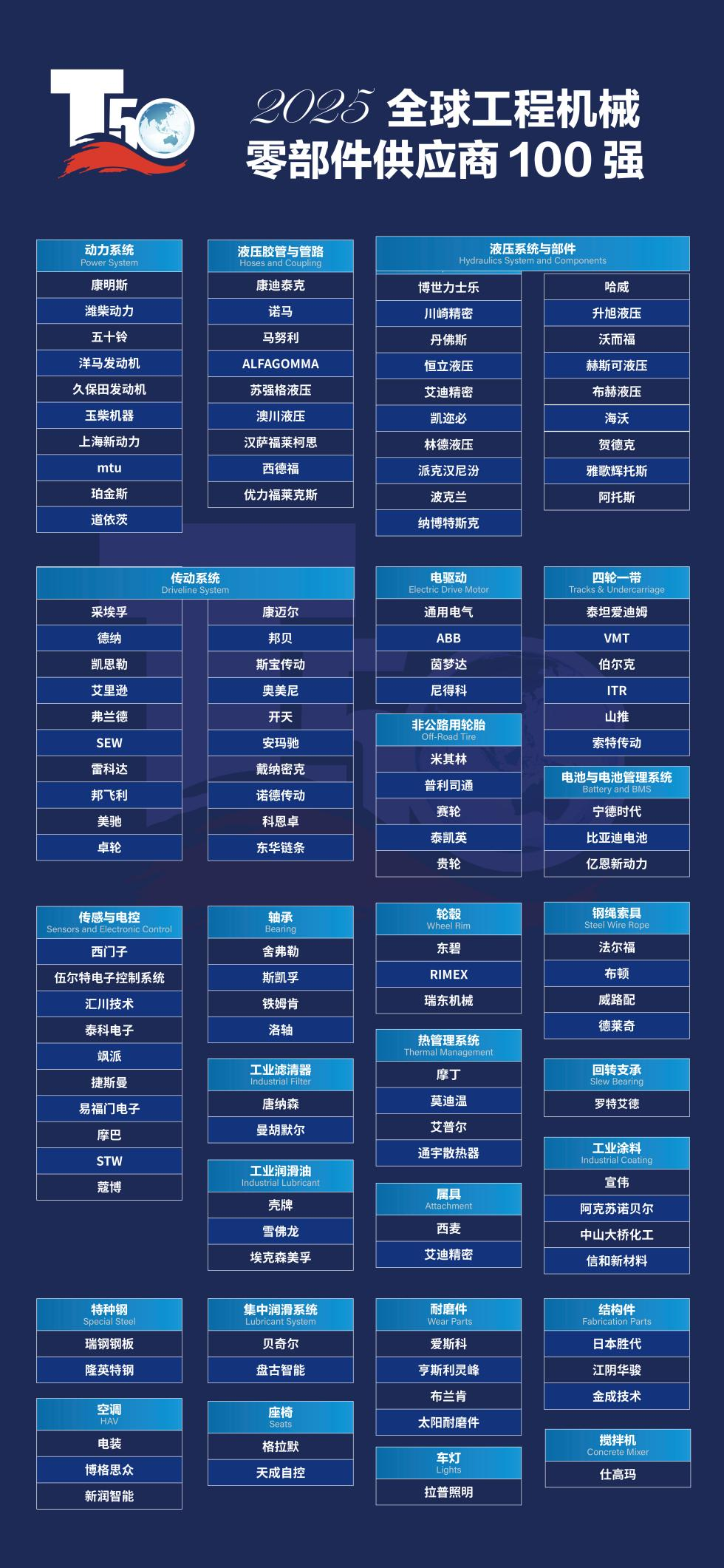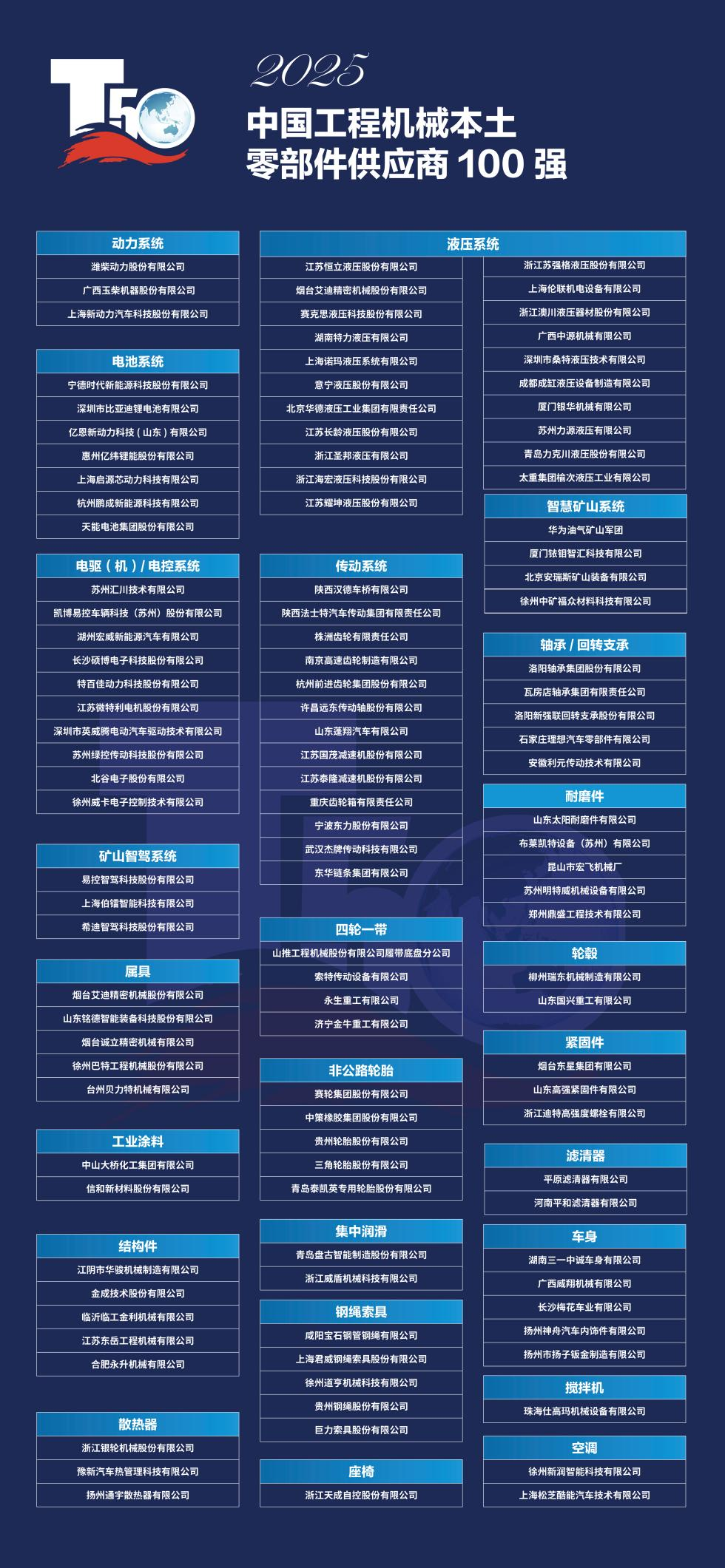 本屆“中國工程機械零部件供應商100強”榜單,除覆蓋動力系統(tǒng)、液壓傳動、四輪一帶、屬具、結(jié)構(gòu)件、車身、鋼繩索具、涂料等傳統(tǒng)部件外,還增設了電池系統(tǒng)、電驅(qū)電控、智慧礦山、礦山智駕等前沿領域,共24種細分品類。