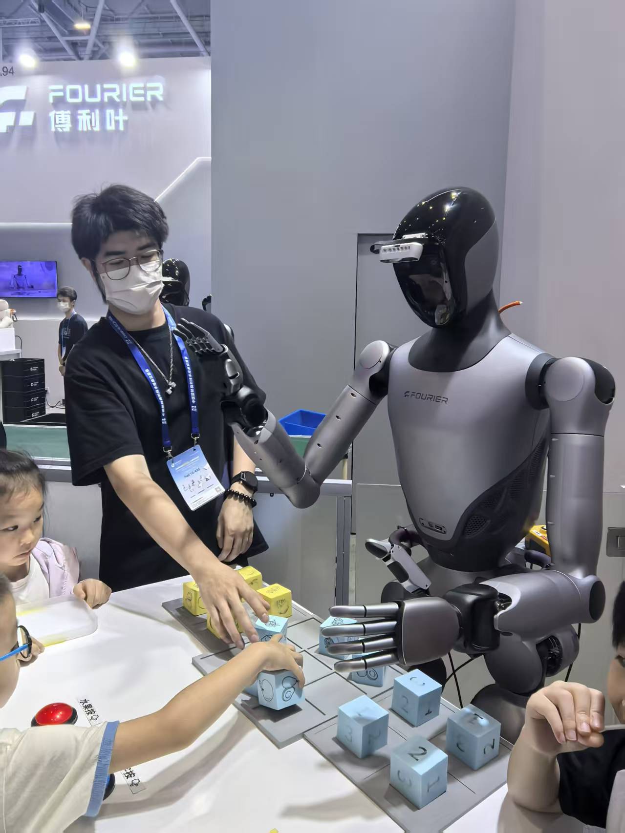 在傅利葉工業(yè)場(chǎng)景演示現(xiàn)場(chǎng),多臺(tái)人形機(jī)器人正分工協(xié)作,流暢完成料箱搬運(yùn)、物料交接與分揀等程序。傅利葉最新一代GR-3人形機(jī)器人則化身“講解員”,以憨態(tài)可掬的外形和標(biāo)準(zhǔn)的普通話向觀者介紹著產(chǎn)品的技術(shù)細(xì)節(jié)。